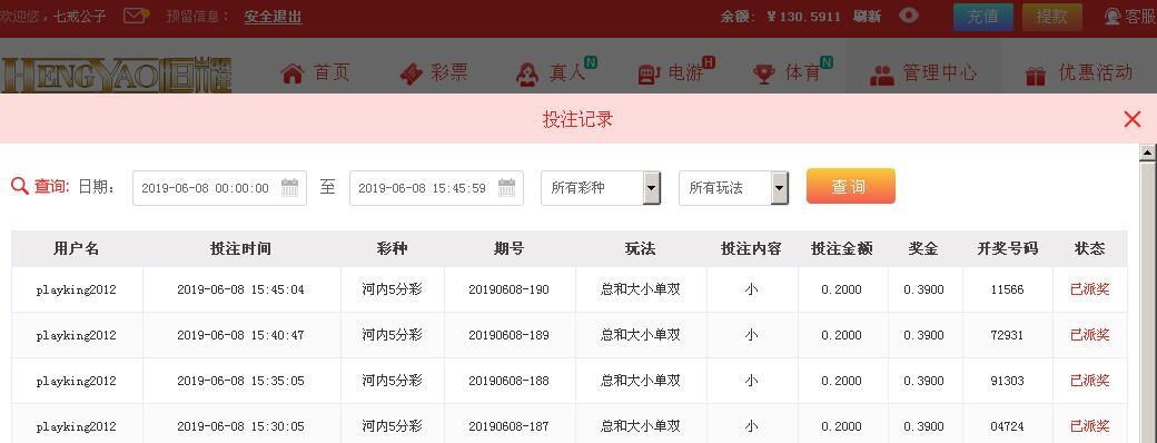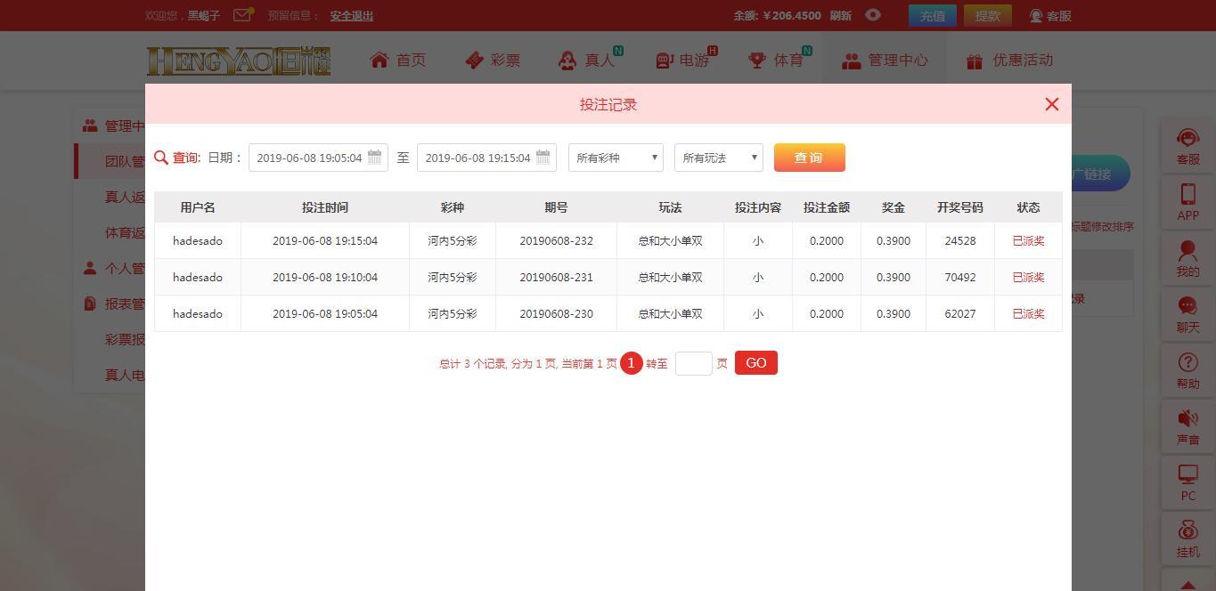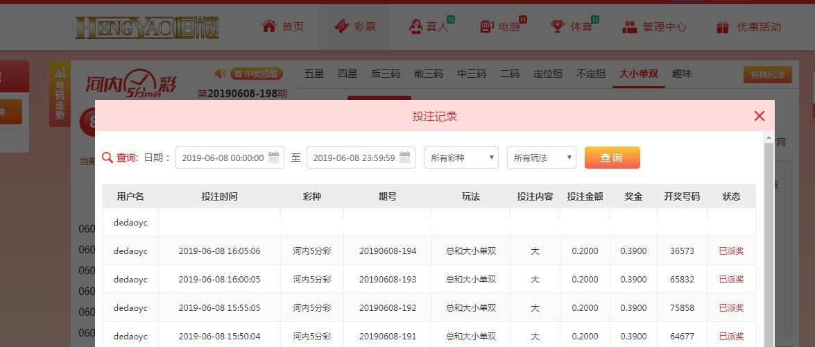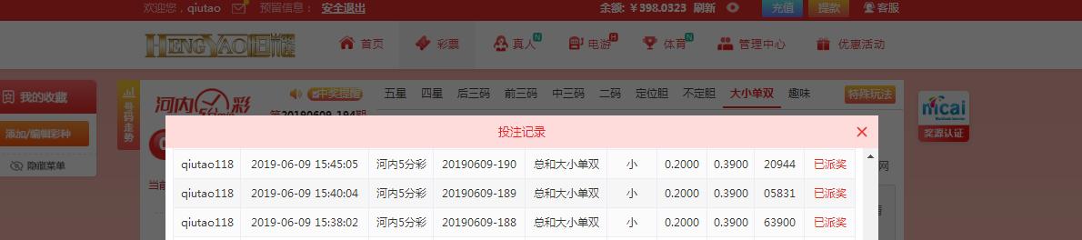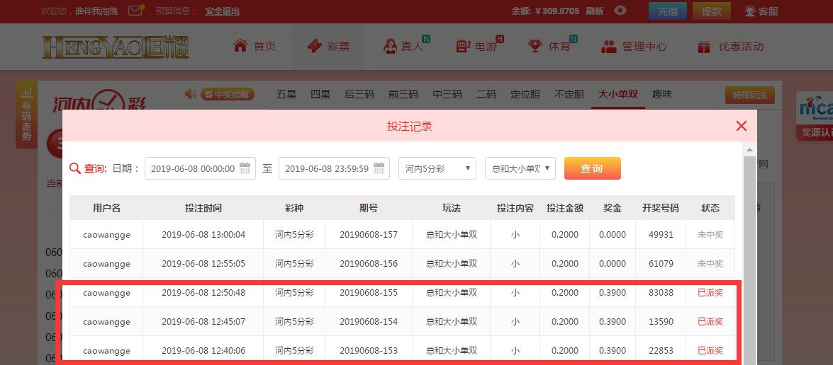 2,在每日中午12:00 活动正式贴中回复,需附带当日12:00至次日11:59内的连续3场投注≥0.2元的恒耀 河内五分彩 大小单双中 总和 大小的下注实战注单截图。
