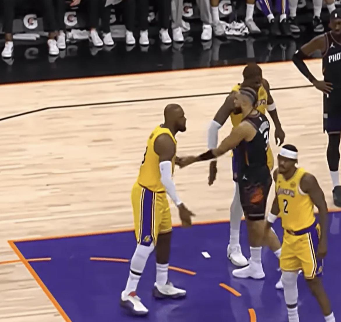 [|篮球赛事] 整活不能少!狄龙在詹姆斯罚球时提前进线,随后与其击掌 |