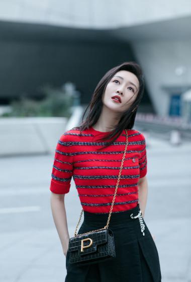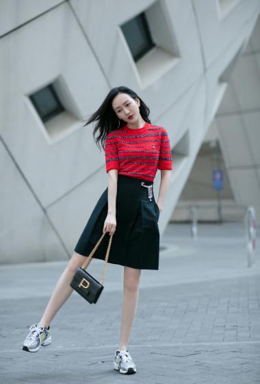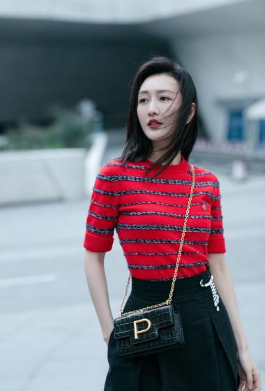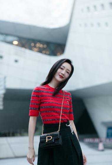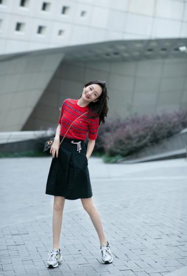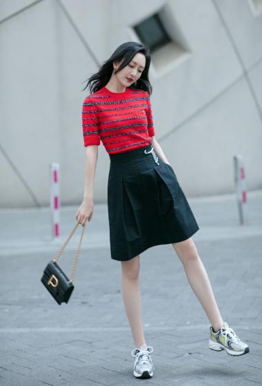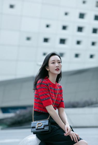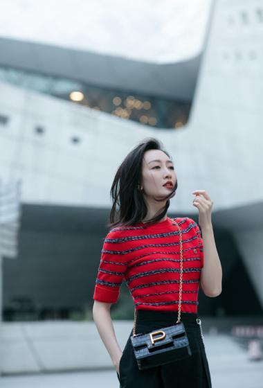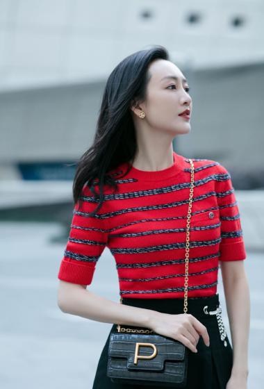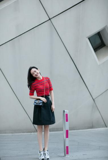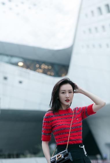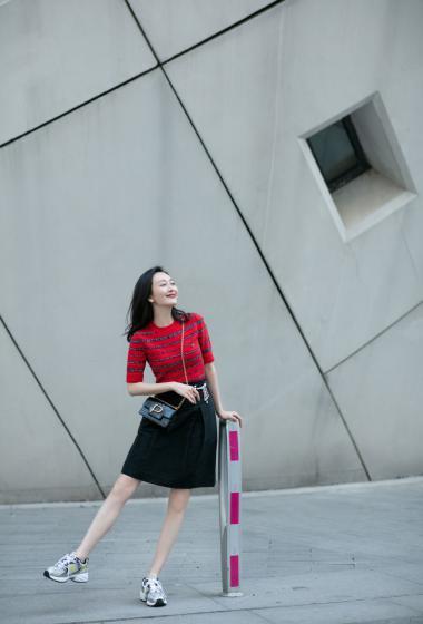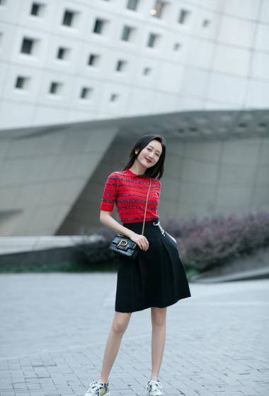 美女王鸥红色条纹衫黑色短裙户外展示成熟女人味【14P】
