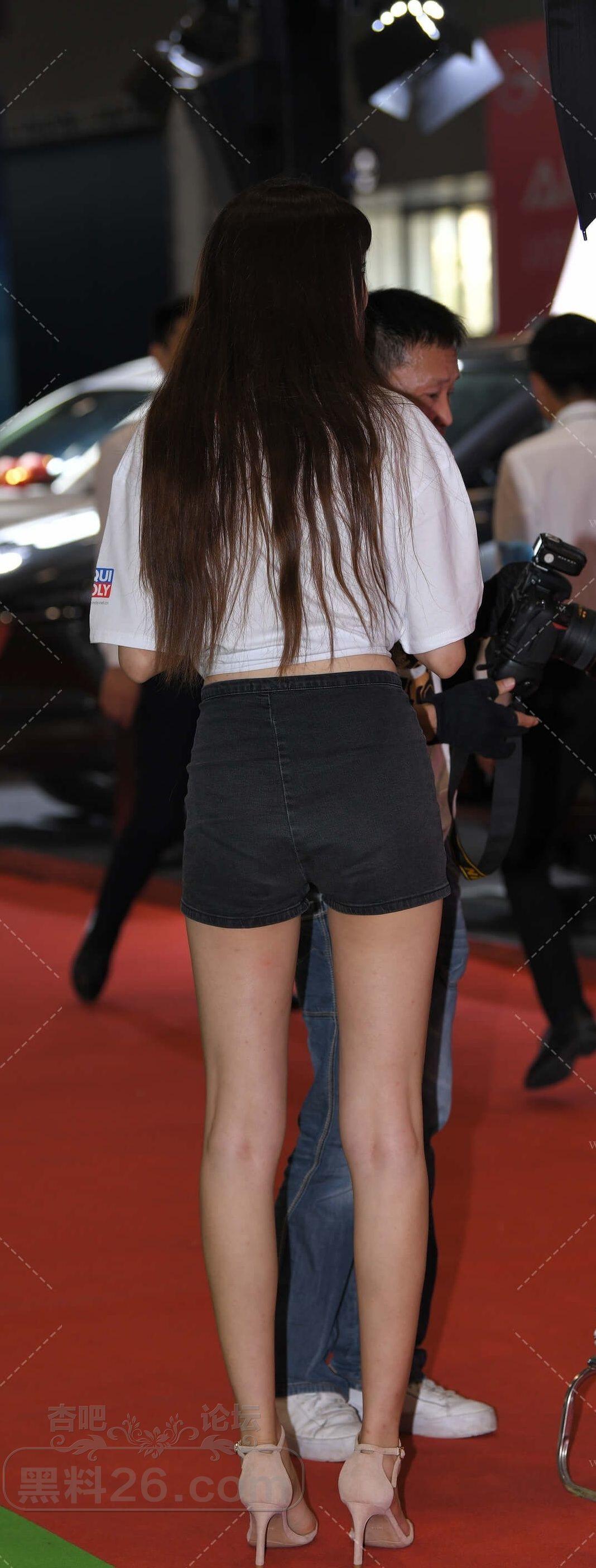 白色短袖黑色短裤年轻女车模细腰长腿诱人【10P】