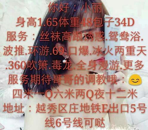 标题没有写联系成功的帖子请谨慎购买,不一定能联系成功的,先钱不可信 【寻欢时间】:2016年11月 【寻欢地点】:天河包房 可上门 【信息来源】:网络 【服务项目】:鸳鸯浴,水中萧,调情,波推,臀推,漫游,冰火,69无套口交 【妹妹数量】:没问 【环境设备】:该有都有 【营业时间】:这个需要自己问 【价格一览】:400 【安全评估】:不去最安全 【服务星级】:70 【重点推荐】:无 【寻欢细节】:400的这个价格也对得起这个服务了 【总体评价】:略 【联系方式】: