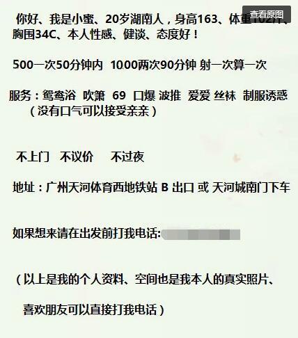 标题没有写联系成功的帖子请谨慎购买,不一定能联系成功的,先钱不可信 【寻欢时间】:2016年11月 【寻欢地点】:广州天河区 【信息来源】:网络 【服务项目】:鸳鸯浴 波推 吹箫 爱爱 丝袜 制服诱惑 【妹妹数量】:没问 【环境设备】:该有都有 【营业时间】:这个需要自己问 【价格一览】:500 【安全评估】:不去最安全 【服务星级】:70 【重点推荐】:无 【寻欢细节】:自荐的妹子,小蜜、20岁湖南人,身高163、体重104斤、胸围34C 【总体评价】:略 【联系方式】: