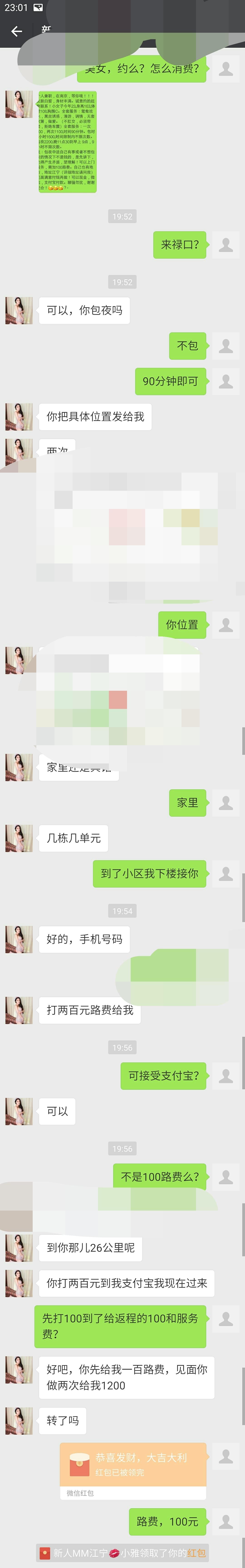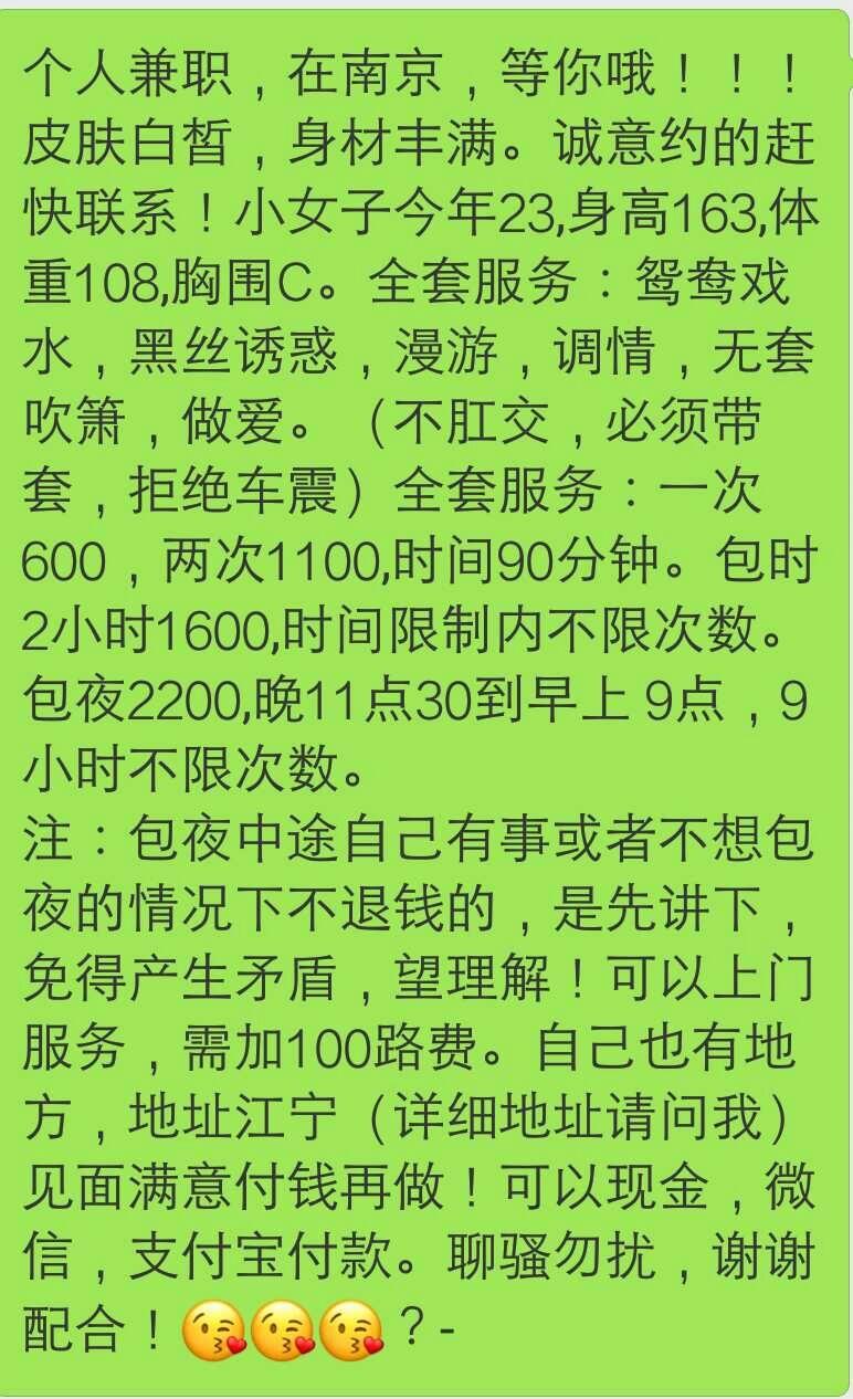 【寻欢时间】:2017年10月20日 【寻欢地点】:自己家 【信息来源】:QQ群 【服务项目】:鸳鸯浴、黑丝诱惑、漫游、调情、无套口、做(不肛交、不无套、不车震) 【妹妹数量】:至少2个 【环境设备】:自己家,妹子也有公寓可以去 【营业时间】:下午和晚上 【价格一览】:600/1P或60分钟 1100/2P或90分钟 1600/2小时 2200/晚 【安全评估】:自己家100,妹子公寓未知 【服务星级】:★★★★☆ 四星半 【重点推荐】:妹子很温柔,有点小肉肉的,喜欢肉感的朋友可以尝试。 【联系方式】:[unfree]微信:yue65891;电话15996410842[/unfree] 【寻欢细节】:昨日小生闲来无事,逛了QQ群,找到江宁区的一个妹子,看照片还行,就加了好友和微信。微信试探,发现提供上门服务,而且能去家里,不用开房间,遂约(需支付来回车费,小生住的比较偏远,付了200元)。妹子到后,看妹子身材略微肉感,小腹处也有点儿赘肉,但又不失婀娜。拥抱发现妹子身体很软,抱着很舒服。调情一番后共浴,脱了衣服见妹子腰是腰臀是臀的,身材凹凸有致,立马就起竿了。上床口,要求不带套,但是妹子不愿意,坚持要戴套口,不强求,戴套口就带套口。妹子口活一般,有点齿感,她还推说是我太大了。口了一会儿准备进入正题,遂掰开妹子双腿。妹子有个刮了毛的,小麦色的小妹妹,分开大阴唇,里面肉嫩红,洞口挺小。小生兴致盎然,立马开始上高山下陡坡钻地道,只觉如履平地。正是:细腻润滑犹如丝绸绕指,温润浩瀚恰似鱼入汪洋;笑谈声声可比银铃微荡,娇喘阵阵正是抚地清风;无脏口之污耳,有私语可助威;娇娇然如小家碧玉,款款哉若红颜知己。可惜小生身体状况不称心意,只做了一次,妹子也不肯宽限十多分钟让我射第二次。虽然价格偏贵,但仍觉得物有所值。 【附带照片】: